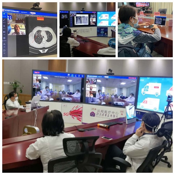 2月25日,在中国联通5G网络和医疗云平台支撑下,横跨武汉、北京和舟山三地共六个会场的新冠肺炎CT远程会诊顺利举行。