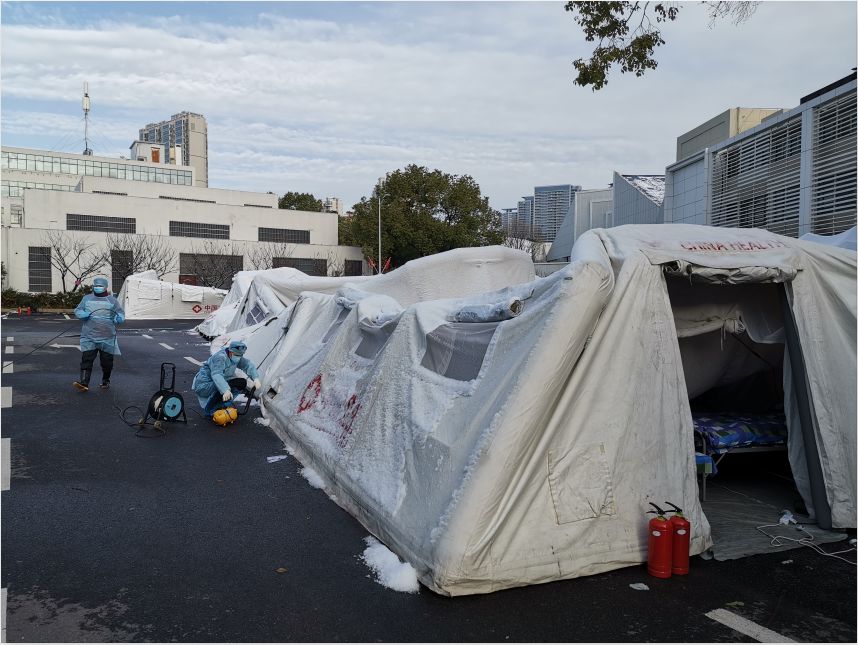 2月14日,武汉突降大雪,保障队员紧急为帐篷进行除雪。