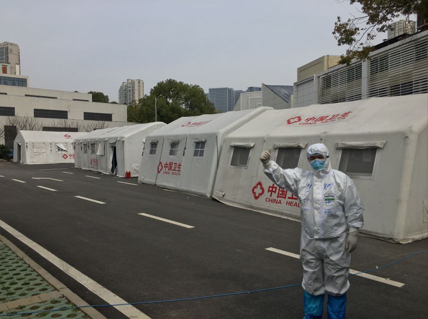 来自中国航天科工的“移动医院”装备保障队员和上海复旦大学附属华山医院医护人员在武昌方舱医院前合影。