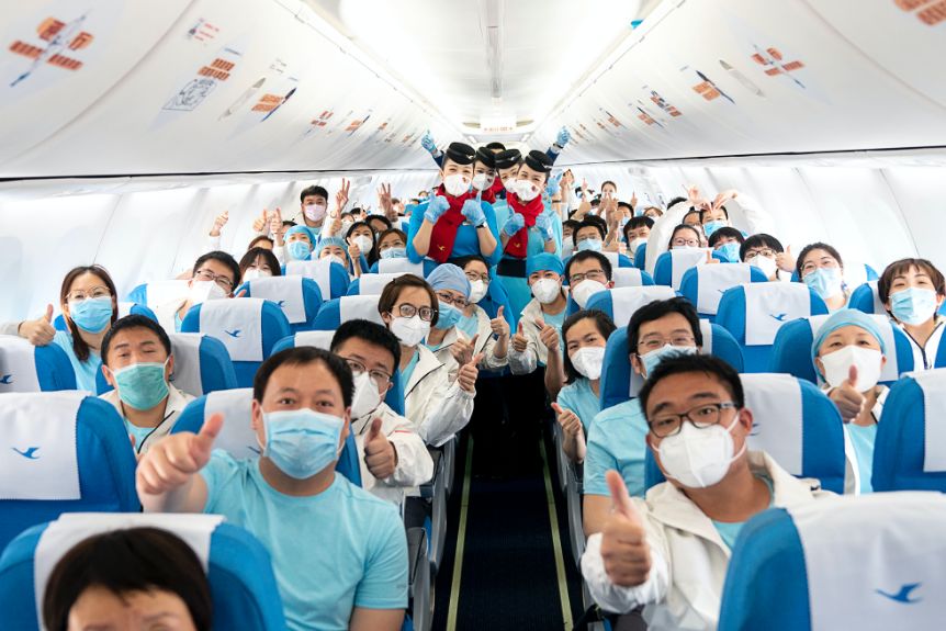 3月17日,东航执行首批6班返程包机,接回江苏、甘肃、青海援鄂医疗队员681人。