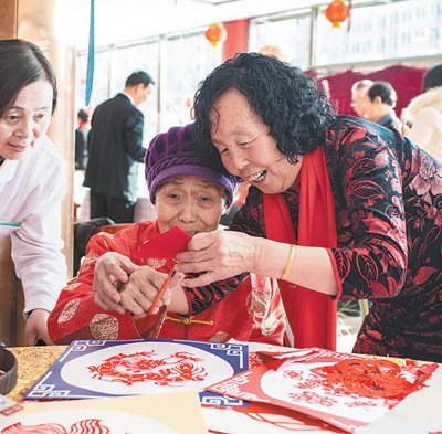 内蒙古自治区呼和浩特市,老人在和养老院志愿者剪窗花。