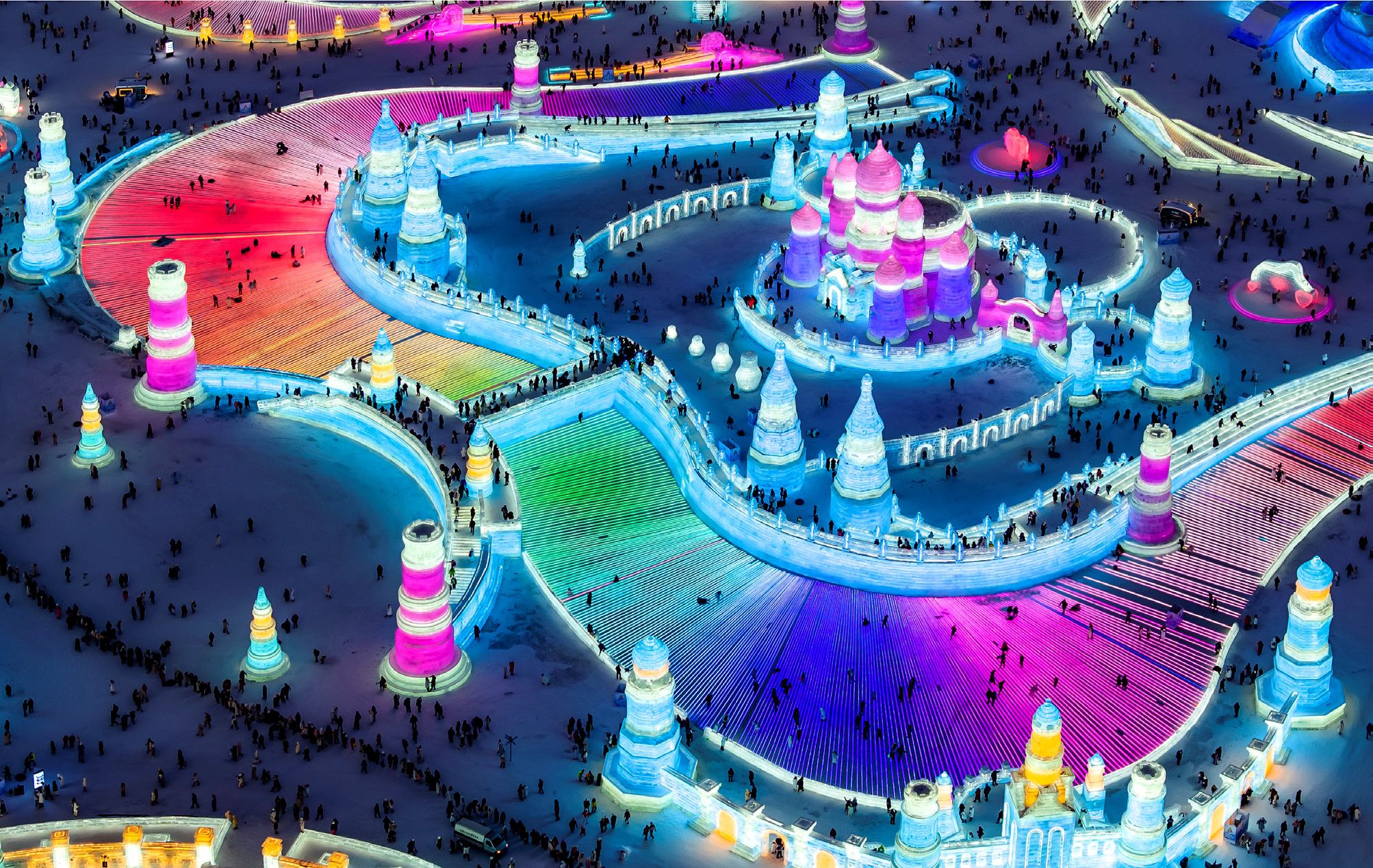 2023年12月17日,黑龙江哈尔滨,第二十五届哈尔滨冰雪大世界华灯璀璨,吸引众多游客观光赏灯。