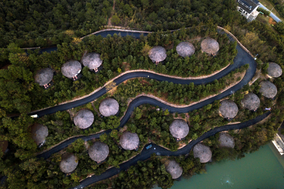 浙江省湖州市德清县筏头乡“裸心谷生态度假村”俯瞰,这里有以低碳理念兴建的“森林度假夯土小屋”建筑群。