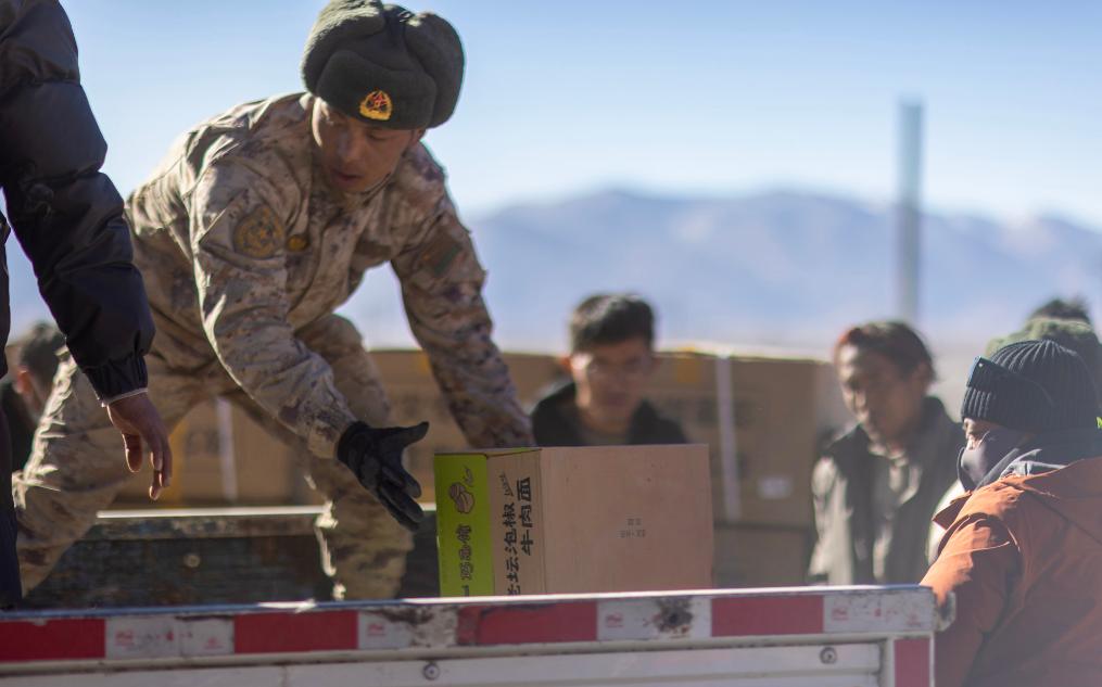 1月8日,解放军战士在尼辖乡雪龙村帮助受灾群众搬运生活物资。新华社记者 姜帆 摄