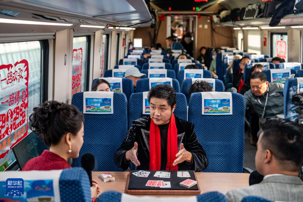 1月14日,魔术师戚原睿(中)在D87次中老铁路国际旅客列车上表演近景魔术。