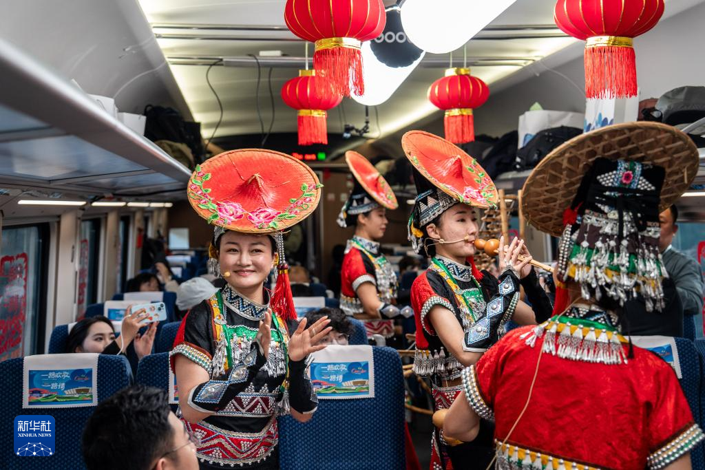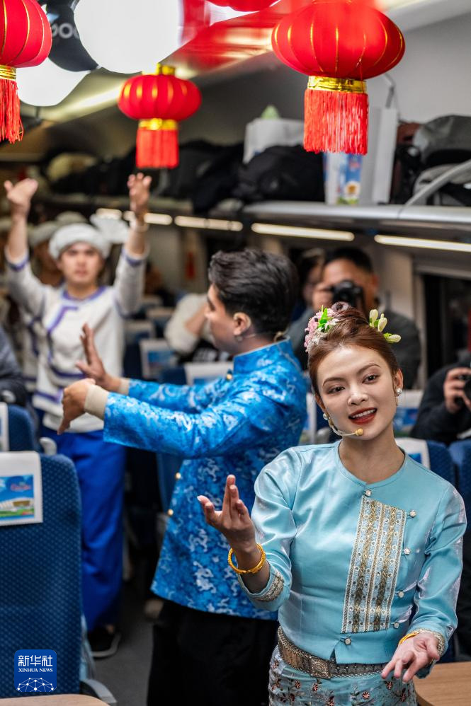 1月14日,西双版纳州民族文化工作团的演员在D87次中老铁路国际旅客列车上表演节目。