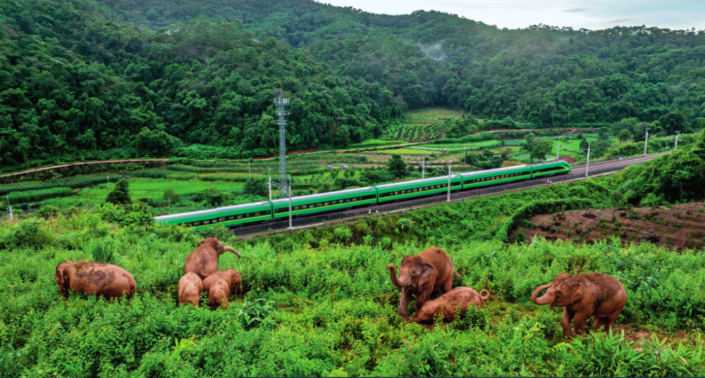 “然然家族”和“短鼻家族”象群在云南省西双版纳傣族自治州景洪市大渡岗乡活动时,一列复兴号列车从中老铁路上驶过(2024年8月8日摄) 胡超摄/本刊