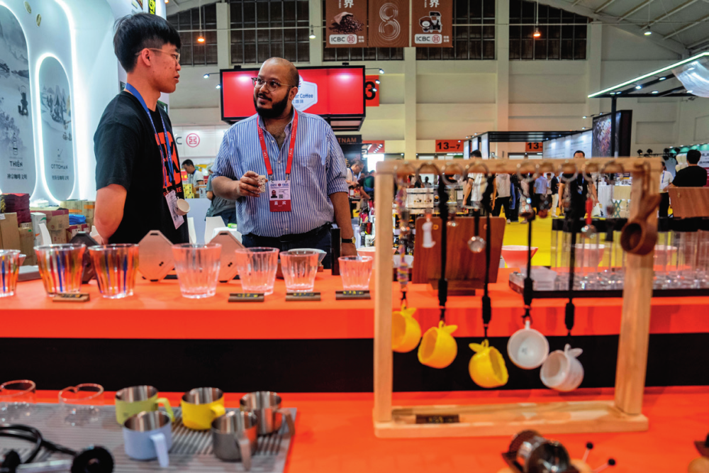 在南博会咖啡产业馆,一名外国嘉宾向展商咨询咖啡冲泡器具(2024年7月24日摄)胡超摄/本刊
