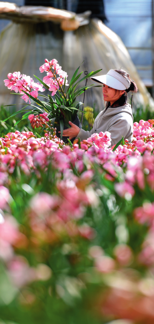 在昆明金才农业科技有限公司种植基地,工作人员在查看大花蕙兰生长情况(2024年11月25日)彭奕凯摄/本刊