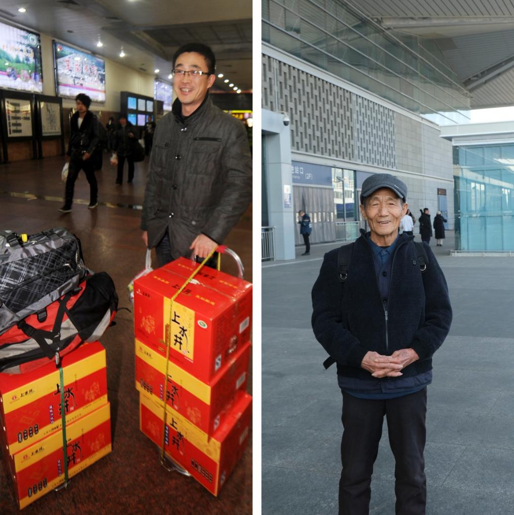 拼版照片。左图为:2013年1月30日,来自内蒙古包头的徐长青在太原站候车,他买了五箱山西老陈醋带回家(新华社记者燕雁摄);右图为:2025年1月18日,在太原南站,一位老人背着一个双肩包轻松返乡(新华社记者王学涛 摄)。新华社发