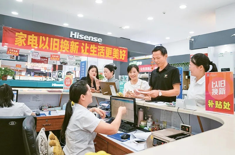 2024年,我国推出“两重”、“两新”政策,着力扩大国内需求。截至2024年12月13日零时,消费品以旧换新政策整体带动相关产品销售额超1万亿元。图为9月24日,在湖南省汨罗市天虹电器城,市民积极参与以旧换新活动。新华社记者 陈思汗/摄