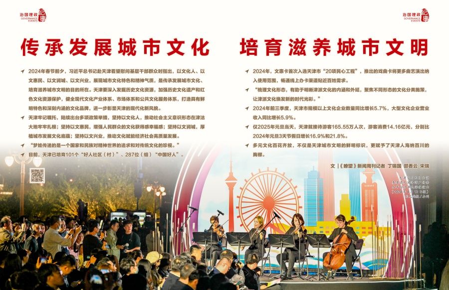 《关于推动文化传承发展的意见》《关于加强文旅深度融合推动旅游业高质量发展的实施方案》《天津市国有文化企事业单位盘活存量资产实施方案》……天津牢记嘱托,陆续出台多项政策举措,坚持以文化人,推动社会主义意识形态在津沽大地牢牢扎根;坚持以文惠民,增强人民群众的文化获得感幸福感;坚持以文润城,厚植城市发展文化底蕴;坚持以文兴业,推动文化赋能经济社会高质量发展。