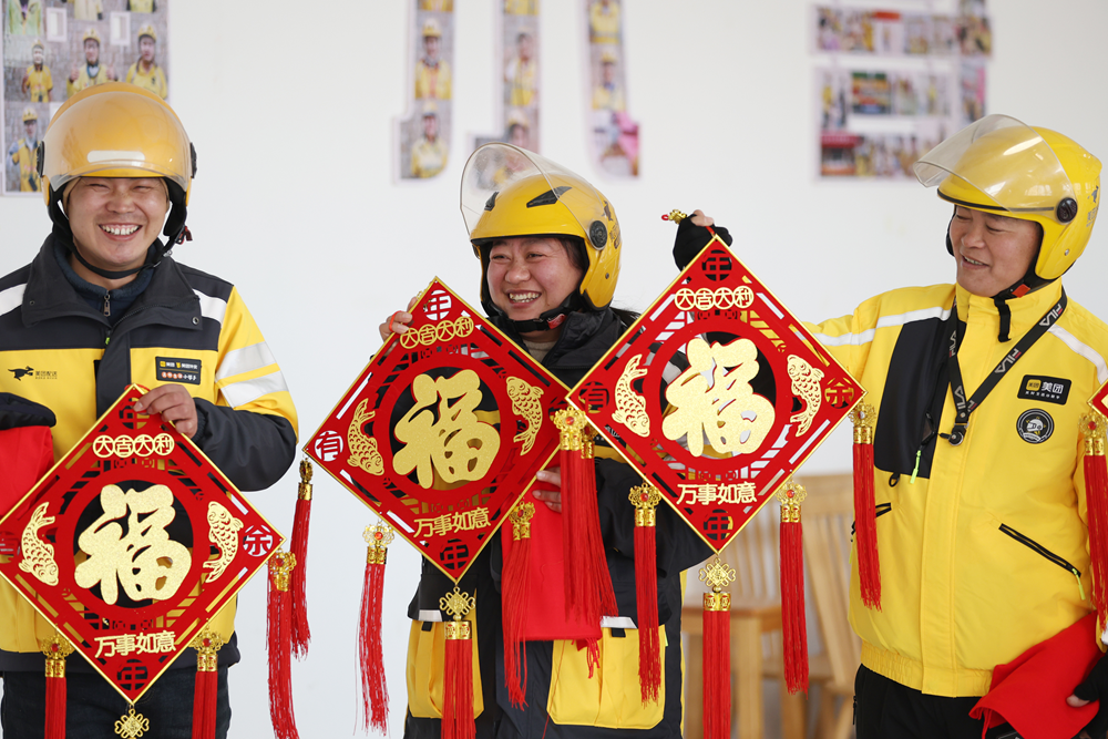春节将至,山东省临沂市郯城县郯城街道开展“送福迎春节 关爱新就业群体”活动,为外卖骑手等新就业群体送上围巾、手套等防寒物品以及春节饰品,喜迎新春佳节的到来。人民图片 张春雷/摄