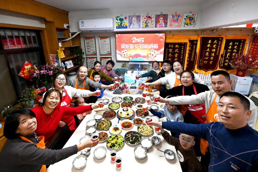 开饭了!大家围聚在桌前,期待“常姐”的新年致辞。