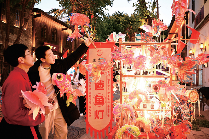 乙巳蛇年春节临近,福建省福州市上下杭历史文化街区年味十足,“来福州,过福年”2025年福州新春文化旅游月活动在这里举行。图为1月18日游客在选购非遗鱼灯。 福建省委宣传部供图