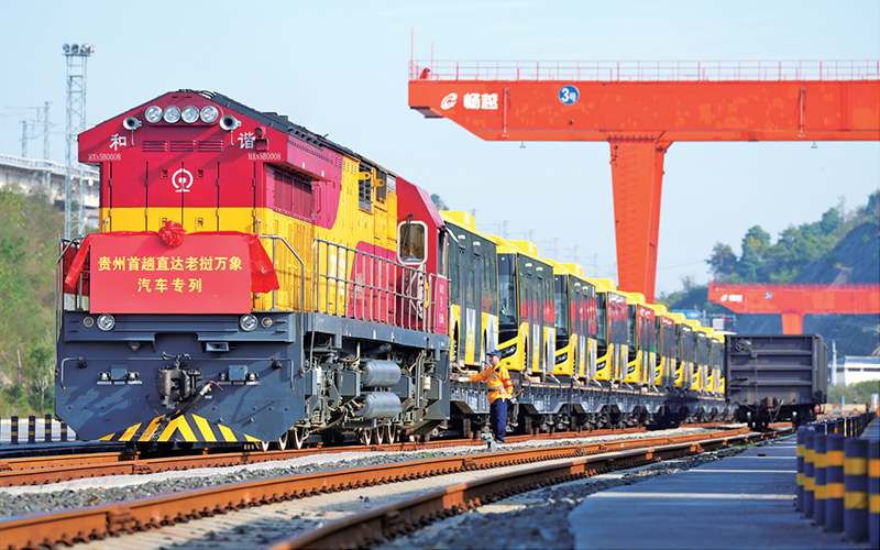 图为2024年10月28日,装载“贵州造”新能源客车的出口专列停靠在贵阳国际陆港都拉营站。新华社记者 刘续/摄