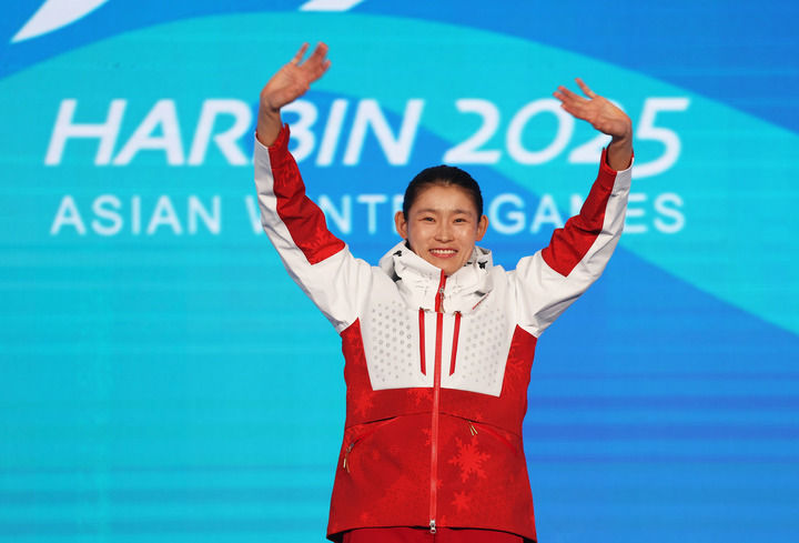 2025年2月8日,冠军中国选手李磊在第九届亚冬会越野滑雪女子个人短距离(传统技术)颁奖仪式上。新华社记者 杨青 摄