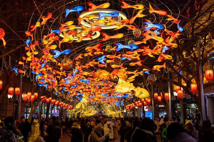 本届亚冬会恰逢首个非遗中国年,亚洲来宾在哈尔滨过足了“春节瘾”。这些天,冰城街头巷尾张灯结彩、游人如织。在中央大街,火红灯笼高高挂,造型各异的锦鲤花灯栩栩如生;太阳岛雪博会上,网红大雪人扎着红色围巾,喜气洋洋地向游客问好。