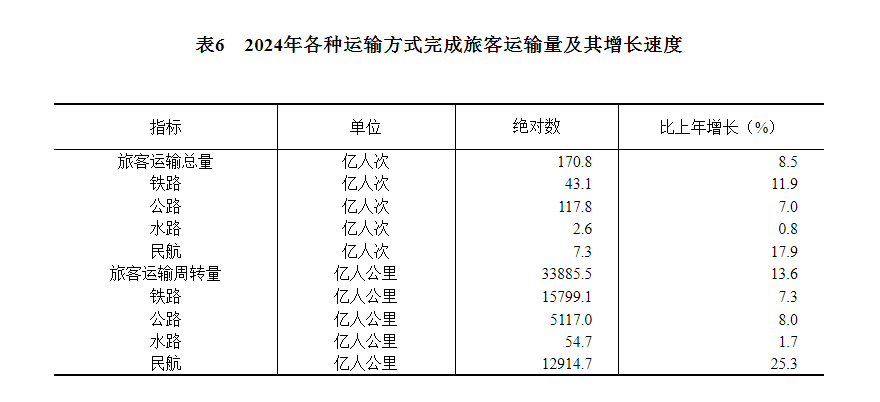 [29]自2024年1月起,公路旅客运输量、公路旅客运输周转量统计口径进行了调整,将班车包车客运量、公共汽电车城际城乡客运量、出租汽车(含巡游出租汽车、网络预约出租汽车)城际城乡客运量纳入公路旅客运输量统计,公路旅客运输周转量统计口径相应调整。2024年旅客运输总量、旅客运输周转量、公路旅客运输量、公路旅客运输周转量增速按可比口径计算。