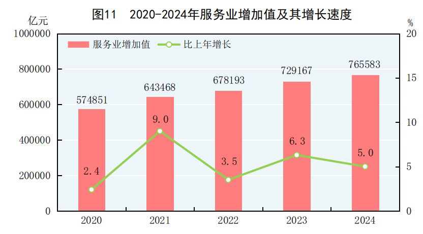 [14]规模以上服务业统计范围包括:年营业收入2000万元及以上的交通运输、仓储和邮政业,信息传输、软件和信息技术服务业,水利、环境和公共设施管理业,卫生行业法人单位;年营业收入1000万元及以上的房地产业(不含房地产开发经营),租赁和商务服务业,科学研究和技术服务业,教育行业法人单位;以及年营业收入500万元及以上的居民服务、修理和其他服务业,文化、体育和娱乐业,社会工作行业法人单位。2024年规模以上服务业企业财务指标增速按可比口径计算。