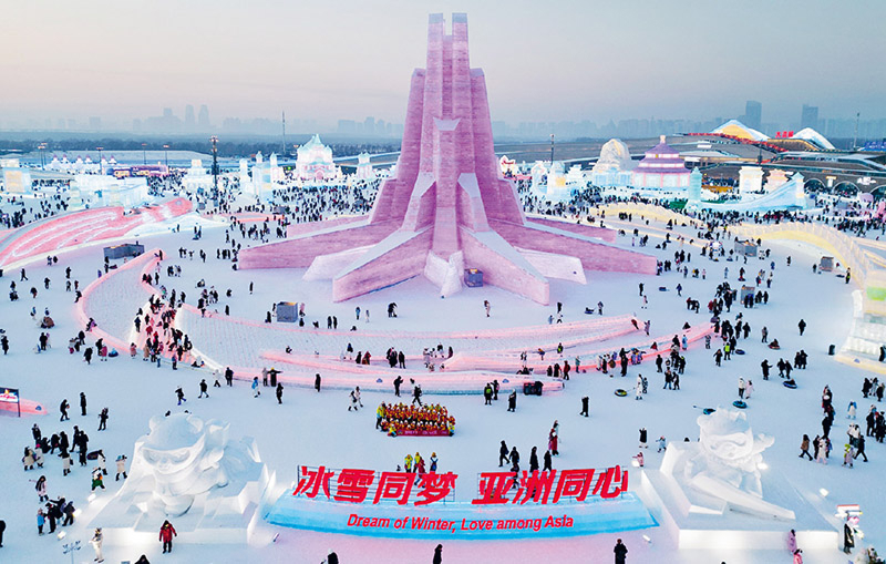 2025年2月7日至14日,第九届亚冬会在哈尔滨成功举行,本届亚冬会以“冰雪同梦、亚洲同心”为主题,在冰城哈尔滨共赴一场冰雪运动与冰雪文化的盛宴。图为游客在哈尔滨冰雪大世界园区内游览(2025年1月23日摄,无人机照片)。新华社记者 张涛/摄