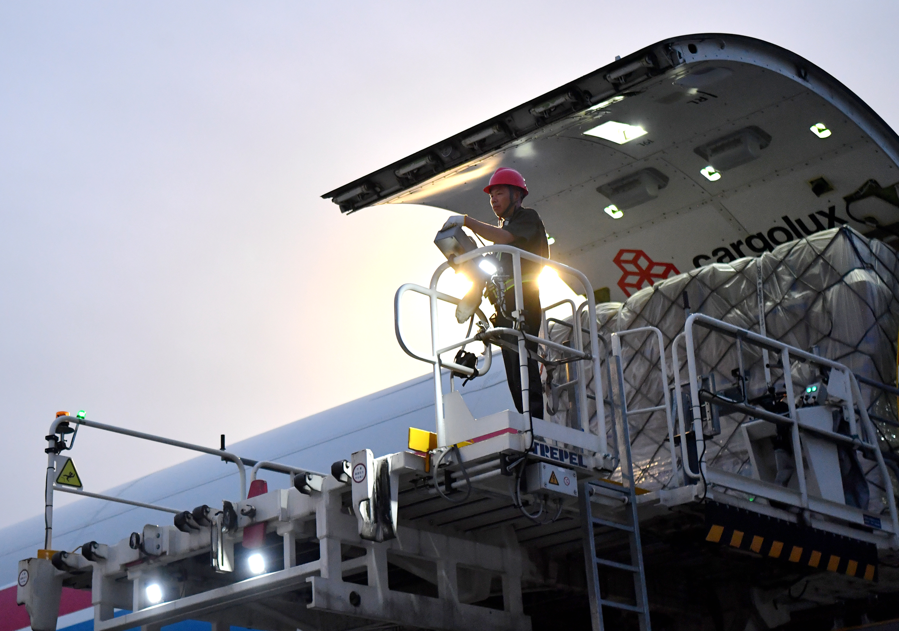 党的十八大以来,中部地区积极构建现代化产业体系,培育和发展新兴产业,对外贸易额快速增长,通过优势互补、产业融合、协同发展,形成推动高质量发展的合力,持续打造更具竞争力的内陆开放高地。图为工作人员在郑州新郑国际机场为一架卢森堡货航货机装货。 新华社记者 李嘉南/摄