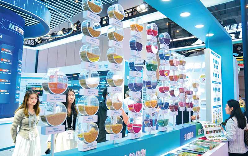 海南坚持“向种图强”,大力发展农业新质生产力,2024年种业产值突破180亿元。图为2025年3月20日,2025种子大会暨南繁硅谷论坛在海南三亚开幕,与会嘉宾在现场观看展览。 海南日报供图 王程龙/摄