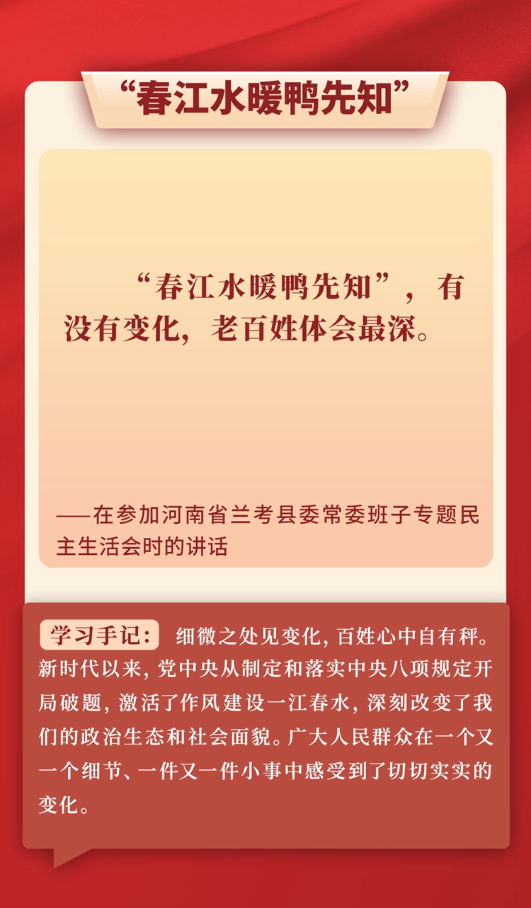 “问渠那得清如许?为有源头活水来。”关于作风建设,习近平总书记常引用各种古语典故,有的从警示层面讲危害,有的从倡导层面谈践行,旁征博引、画龙点睛,把古人智慧化用于作风建设的当代实践,给人以思想启迪、灵魂洗礼。