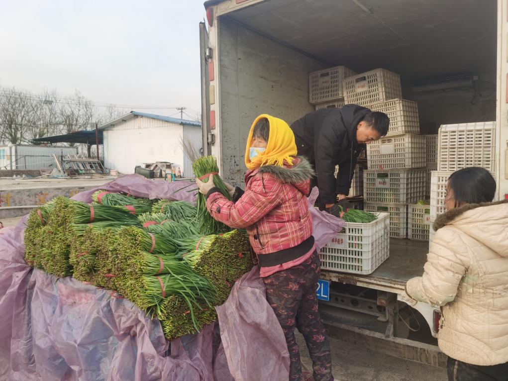 这是邹平市供销合作社联合社下属企业采购车在码头镇收购合作农户当日新鲜韭菜。(马坤 摄)