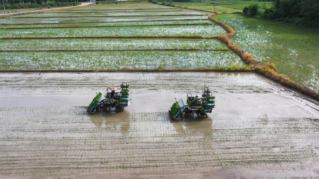 在湖南省益阳市资阳区新桥河镇廖河村,新桥河镇供销合作社进行代机械抛插。(徐嵩 摄)