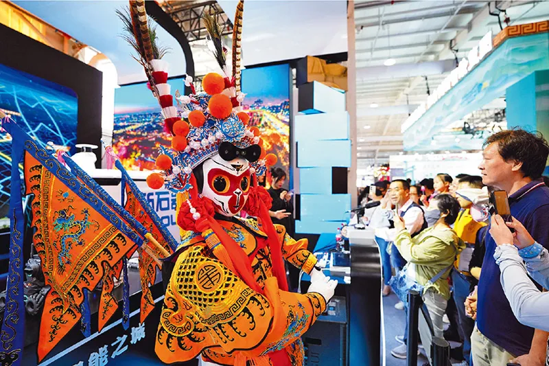 图为2024年9月15日,在服贸会首钢园区的文旅服务专题展区,孙悟空形象的仿生机器人吸引参观者。新华社记者 鞠焕宗/摄