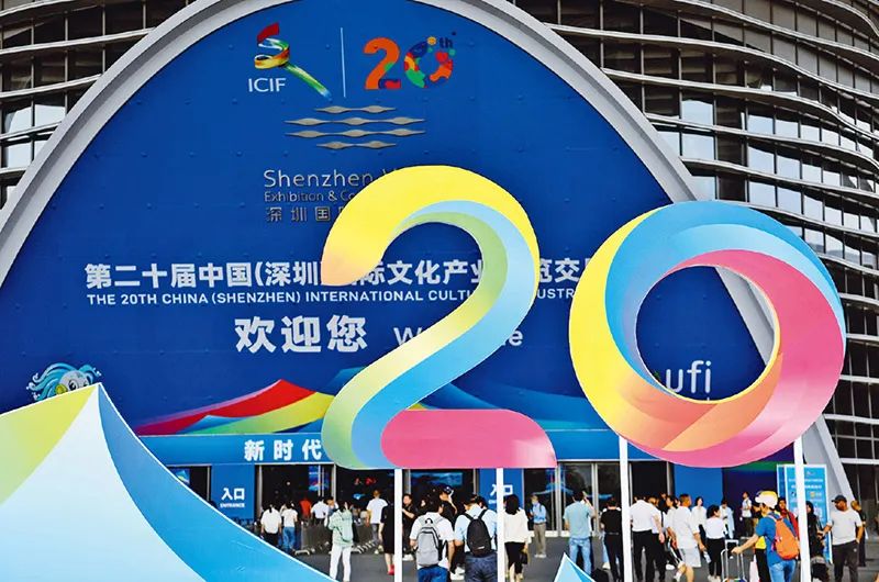 2024年5月23日,为期5天的第二十届中国(深圳)国际文化产业博览交易会开幕。本届文博会设8个展馆,共有超6000家政府组团、文化机构和企业参展,展出文化产品超过12万件,4000多个文化产业投融资项目在现场进行展示与交易。图为当日,观众步入第二十届文博会展馆。 新华社记者 梁旭/摄