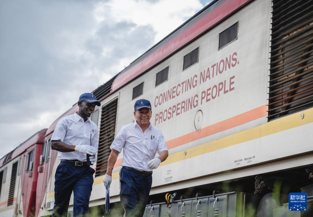 2023年5月23日,在肯尼亚内罗毕,非洲之星铁路运营公司机辆部的火车驾驶员蒋立平(右)与学员霍勒斯从一辆印有“连接国家 走向繁荣”标语的蒙内铁路机车旁走过。 新华社记者 王冠森 摄