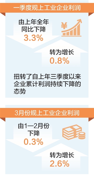 人民日报北京4月27日电 (记者刘志强)27日,国家统计局发布数据:一季度,全国规模以上工业企业利润由上年全年同比下降3.3%转为增长0.8%,扭转了自上年三季度以来企业累计利润持续下降的态势。3月份,规模以上工业企业利润由1—2月份下降0.3%转为增长2.6%,企业当月利润有所改善。