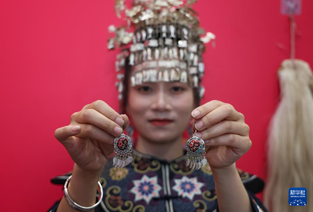 5月22日,在文博会中国妇女发展基金会“天才妈妈”展台,参展商展示贵州水族马尾绣银耳环。