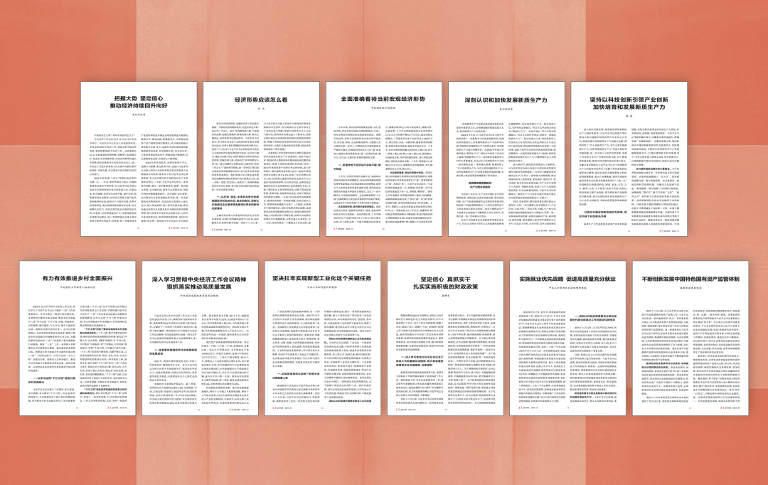 3.深入阐释习近平经济思想,大力唱响中国经济光明论。把经济宣传放在更加突出的位置,一是持续深化习近平经济思想宣传阐释,刊发习近平总书记《开创我国高质量发展新局面》等重要文章,撰写刊发本刊编辑部文章《高质量发展是新时代的硬道理》、本刊评论员文章《把握大势 坚定信心 推动经济持续回升向好》等理论评论文章,组约刊发国家发改委、国家统计局等一批宣传阐释文章,深入宣传我们党对经济工作五个“必须统筹”的规律性认识,深度阐释高质量发展这一新时代的硬道理。二是加强经济形势分析和舆论引导,策划推出署名巨力的《经济形势应该怎么看》等文章,科学辩证分析形势、引导预期。三是加强经济政策解读,紧紧围绕发展新质生产力,策划推出本刊评论员文章、中央部委、科研机构、专家学者等系列文章,深入阐释发展新质生产力的科学内涵和实践要求。四是针对人民群众关心的就业等经济社会热点问题,加强正面解析引导,推动统一思想、凝聚共识、坚定信心。