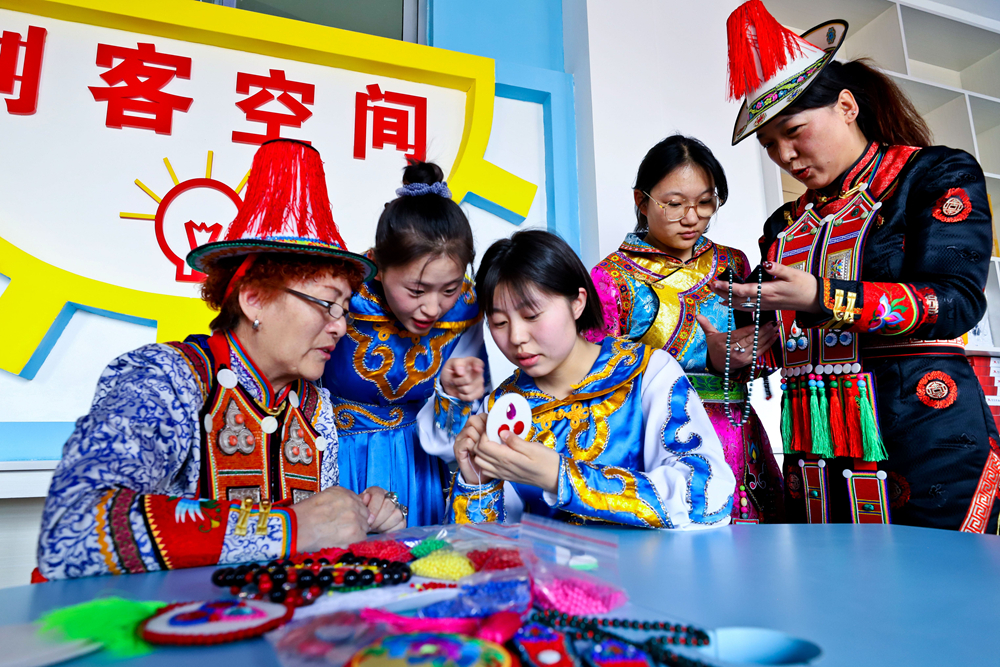 近年来,甘肃省张掖市肃南裕固族自治县将非遗项目引进课堂,培养高素质技能型人才,助推青年就业创业。图为2023年3月21日,国家级非物质文化遗产裕固族服饰传承人(左一)向学生们传授裕固族刺绣技艺。 人民图片 王将/摄