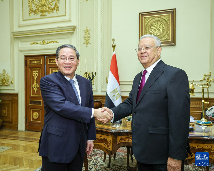 当地时间7月9日,国务院总理李强在开罗会见埃及众议长贾巴利。新华社记者 刘彬 摄