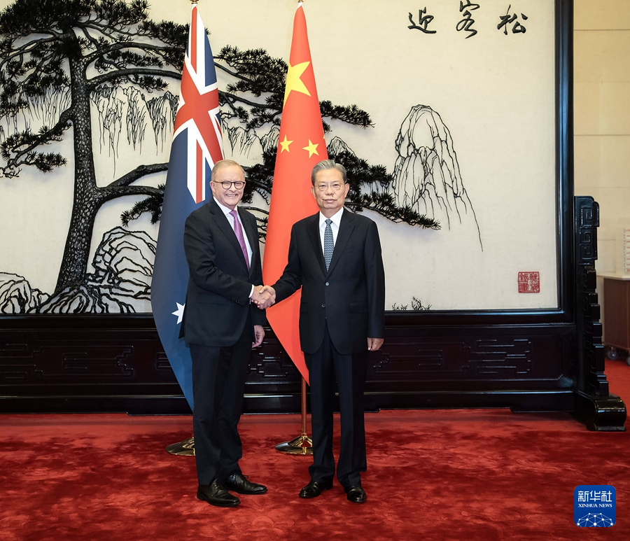 赵乐际表示,今天上午,习近平主席同总理先生举行了富有成果的会见,擘画了中澳关系发展的新蓝图。中方愿同澳方一道,落实两国领导人重要共识,高质量推进互利合作,持续深化民心相通,推动中澳关系长期健康稳定发展。中国全国人大愿同澳大利亚联邦议会加强友好交往,就立法、监督等开展经验交流,为双方务实合作提供法律保障。