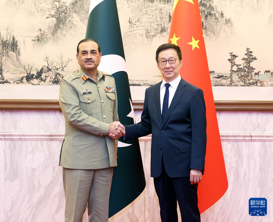7月25日,国家副主席韩正在北京会见巴基斯坦陆军参谋长穆尼尔。新华社记者 刘卫兵 摄
