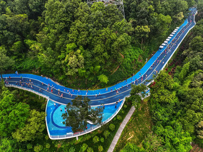 图为2023年6月23日,在浙江省舟山市定海区“东海云廊”的“最美天空跑道”,来自全国各地的711位选手参与山地半程马拉松挑战赛。 中新社发 姚峰/摄