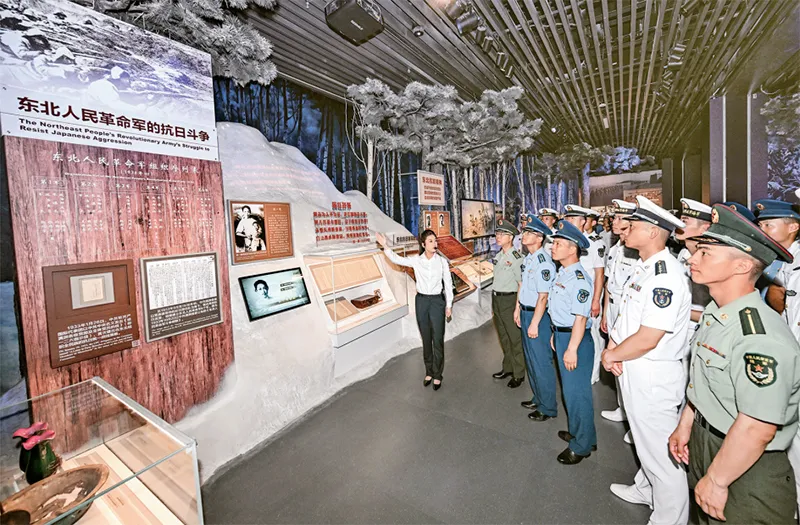 2025年7月7日,纪念全民族抗战爆发88周年仪式暨《为了民族解放与世界和平》主题展览开幕式在中国人民抗日战争纪念馆举行。图为当日解放军官兵参观主题展览。 新华社记者 陈晔华/摄