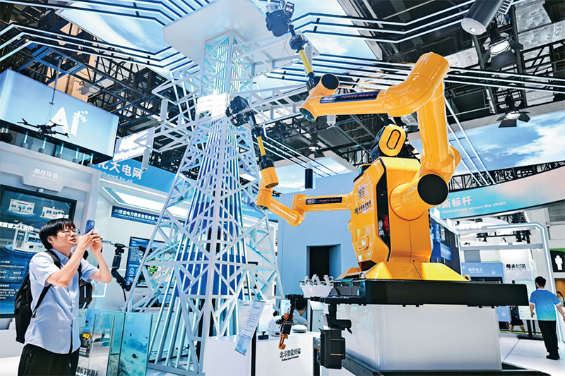 7月26日至28日,2025世界人工智能大会暨人工智能全球治理高级别会议在上海举办。“智能时代 同球共济”的主题贯穿始终,为全球人工智能领域带来一场思想与创新碰撞的盛宴。图为参观者在中国南方电网展区拍摄“悟空”带电作业机器人。 新华社记者 陈浩明/摄