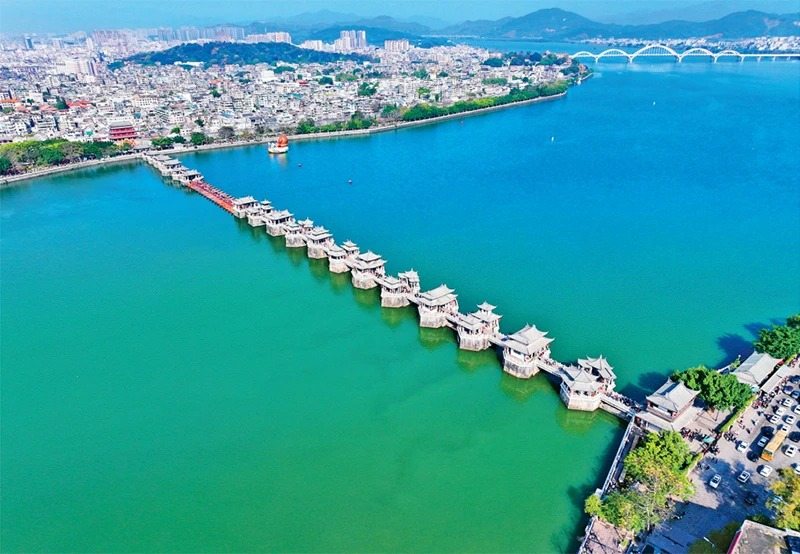 位于广东潮州古城东门外的广济桥始建于南宋年间,集梁桥、浮桥、拱桥于一体,被誉为“世界上最早的启闭式桥梁”。2020年10月,习近平总书记在广济桥考察时指出,广济桥历史上几经重建和修缮,凝聚了不同时期劳动人民的匠心和智慧,具有重要的历史、科学、艺术价值,是潮州历史文化的重要标志。图为2024年2月13日拍摄的广济桥。 人民图片 孙继虎/摄