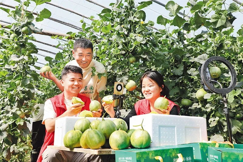 图为2025年5月11日,河南省新乡市延津县南秦庄村甜瓜种植大棚内,党员志愿者通过现场直播,帮助农户推销甜瓜。 人民图片 张燕/摄