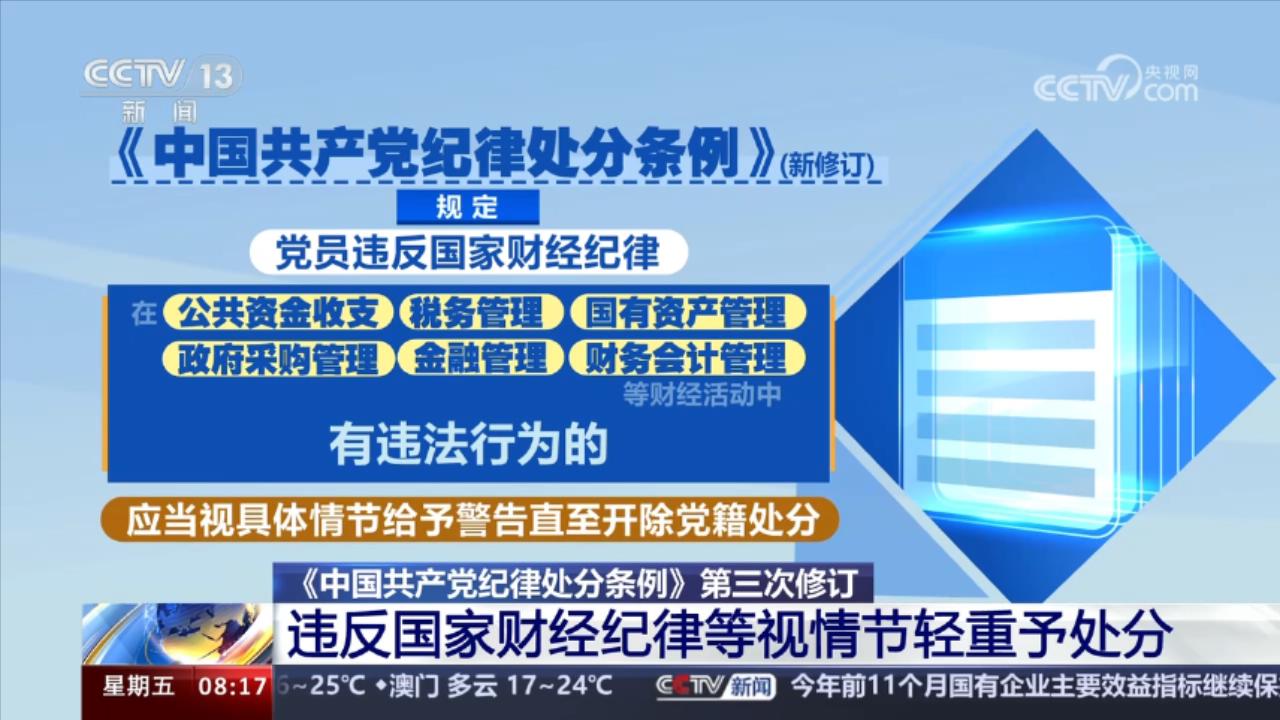 新修订的《条例》规定,党员违反国家财经纪律,在公共资金收支、税务管理、国有资产管理、政府采购管理、金融管理、财务会计管理等财经活动中,有违法行为的,应当视具体情节给予警告直至开除党籍处分。