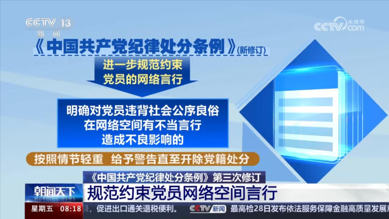 新修订的《条例》进一步规范约束党员的网络言行,明确对党员违背社会公序良俗,在网络空间有不当言行,造成不良影响的,按照情节轻重,给予警告直至开除党籍处分。