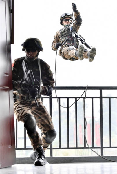 1月7日,武警福建总队机动支队特战大队官兵在楼房反劫持训练中索降突入。