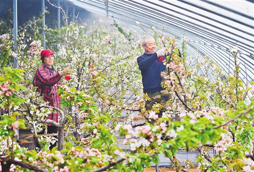 2月20日,果农在石家庄市赞皇县鲍家滩村樱桃种植基地大棚内劳作。 张晓峰摄