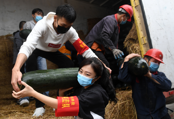 2020年3月3日,在广西南宁国际铁路港,南宁车务段青年突击队队员和工作人员搬运支援湖北的物资。新华社记者 陆波岸/摄